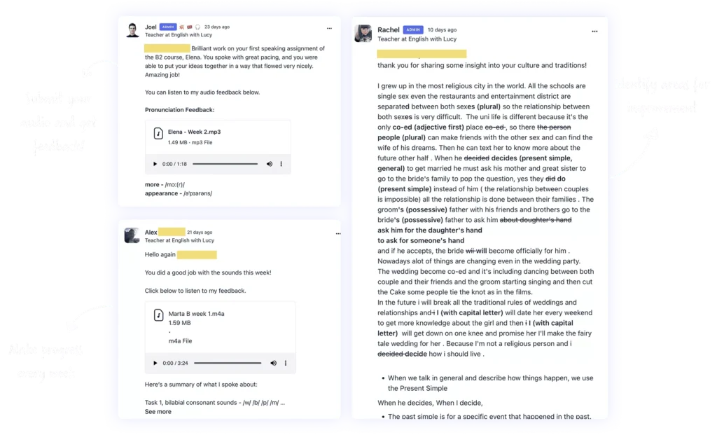 You have the option to join the VIP Feedback Pack version of each programme. With this premium pack, you have formal weekly homework tasks and access to a VIP space in the community for personal teacher feedback. You have both speaking and writing homework. You will get written corrections on all your homework assignments. If you submit recordings for the speaking homework, you will receive audio feedback on your pronunciation, too. (You can choose to switch to only writing, but pronunciation feedback is extremely valuable.) If you don’t want to post publicly, you can submit your homework via email. You have 16 weeks of access to each course community. We can look at extending your access upon request.