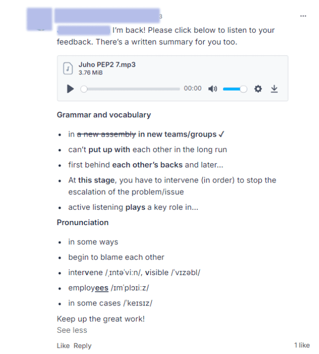 - 6 x personalised speaking and pronunciation feedback & advice (delivered via audio)